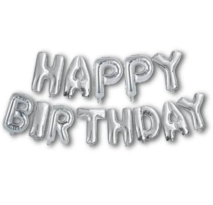 בלוני מיילר כסופים עם האותיות של “HAPPY Birthday” לניפוח אוויר באמצעות הקשית שמגיע בשקית גודל כל אות: 35 ס”מ לא מגיע מנופח