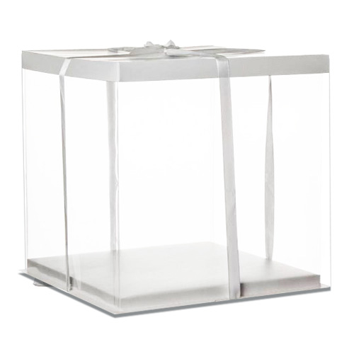 קופסת פי וי סי שקופה לעוגה עם מכסה ותחתית בצבע לבן, קלה לשימוש גודל הקופסא: 30x30x30 ס”מ