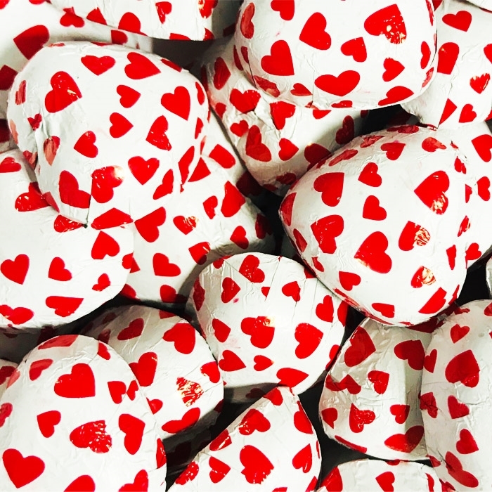 שוקולד חלב איכותי בצורת לב בעטיפת אלומיניום לבנה כמות: 1 ק”ג כשרות: בד”צ