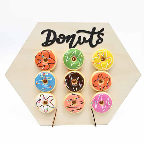 סטנד עץ לדונאטס בצורת משושה, עם כיתוב Donuts