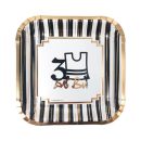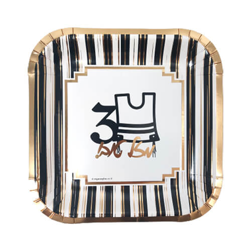 צלחות קטנות לחלאקה בדוגמאת ציצית 3 והכיתוב “מזל טוב” בצבעי שחור זהב לבן
