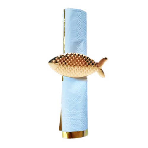 סט חבקי מפיות בצורת דג 6יח עשויים ממתכת בצבע זהב, מושלמים לשולחן ראש השנה.